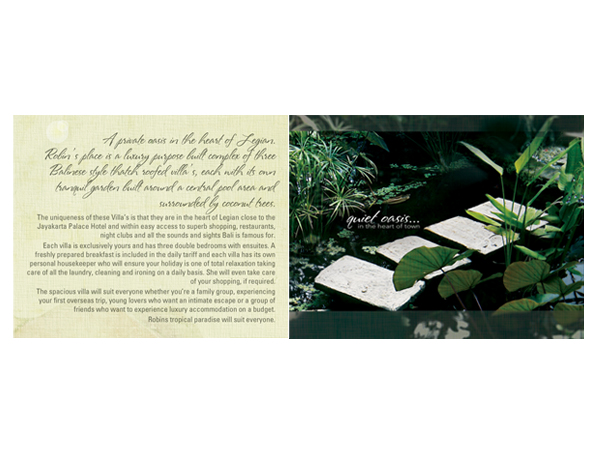 DL Brochure. Robin's Place offers accommodation in a luxury purpose built complex of three Bali-Style thatched villa's in the heart of Legian, Bali